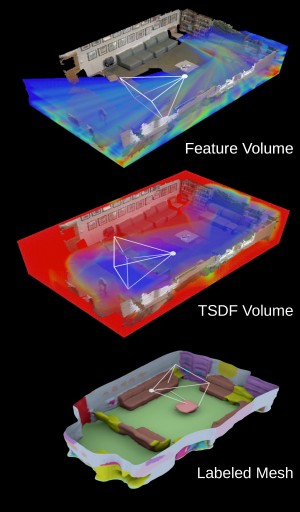Abstract: We present an end-to-end 3D reconstruction method for a scene by directly regressing a truncated signed distance function (TSDF) from a set of posed RGB images. Traditional approaches to 3D reconstruction rely on an intermediate representation of depth maps prior to estimating a full 3D model of a scene. We hypothesize that a direct regression to 3D is more effective. A 2D CNN extracts features from each image independently which are then back-projected and accumulated into a voxel volume using the camera intrinsics and extrinsics. After accumulation, a 3D CNN refines the accumulated features and predicts the TSDF values. Additionally, semantic segmentation of the 3D model is obtained without significant computation. This approach is evaluated on the Scannet dataset where we significantly outperform state-of-the-art baselines (deep multiview stereo followed by traditional TSDF fusion) both quantitatively and qualitatively. We compare our 3D semantic segmentation to prior methods that use a depth sensor since no previous work attempts the problem with only RGB input.