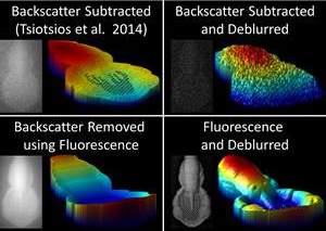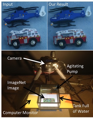 Abstract: Photometric stereo is widely used for 3D reconstruction. However, its use in scattering media such as water, biological tissue and fog has been limited until now, because of forward scattered light from both the source and object, as well as light scattered back from the medium (backscatter). Here we make three contributions to address the key modes of light propagation, under the common single scattering assumption for dilute media. First, we show through extensive simulations that single-scattered light from a source can be approximated by a point light source with a single direction. This alleviates the need to handle light source blur explicitly. Next, we model the blur due to the scattering of light from the object. We measure the object point-spread function and introduce a simple deconvolution method. Finally, we show how imaging fluorescence emission where available eliminates the backscatter component and increases the signal-to-noise ratio. Experimental results in a water tank, with different concentrations of scattering media added, show that deconvolution produces higher-quality 3D reconstructions than previous techniques, and that when combined with fluorescence, can produce results similar to that in clear water even for highly turbid media.