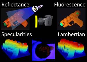Abstract: Beyond day glow highlighters and psychedelic black light posters, it has been estimated that fluorescence is a property exhibited by 20% of objects. When a fluorescent material is illuminated with a short wavelength light, it re-emits light at a longer wavelength isotropically in a similar manner as a Lambertian surface reflects light. This hitherto neglected property opens the doors to using fluorescence to reconstruct 3D shape with some of the same techniques as for Lambertian surfaces – even when the surface’s reflectance is highly non-Lambertian. Thus, performing reconstruction using fluorescence has advantages over purely Lambertian surfaces. Single image shape-from-shading and calibrated Lambertian photometric stereo can be applied to fluorescence images to reveal 3D shape. When performing uncalibrated photometric stereo, both fluorescence and reflectance can be used to recover Euclidean shape and resolve the generalized bas relief ambiguity. Finally for objects that fluoresce in wavelengths distinct from their reflectance (such as plants and vegetables), reconstructions do not suffer from problems due to inter-reflections. We validate these claims through experiments.